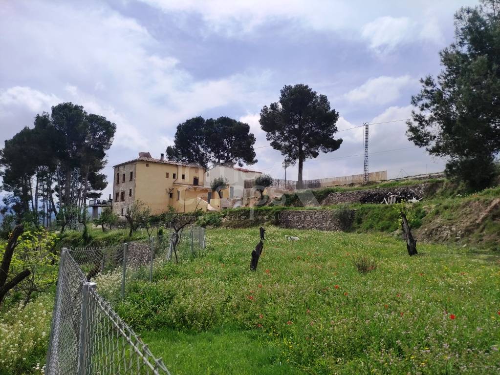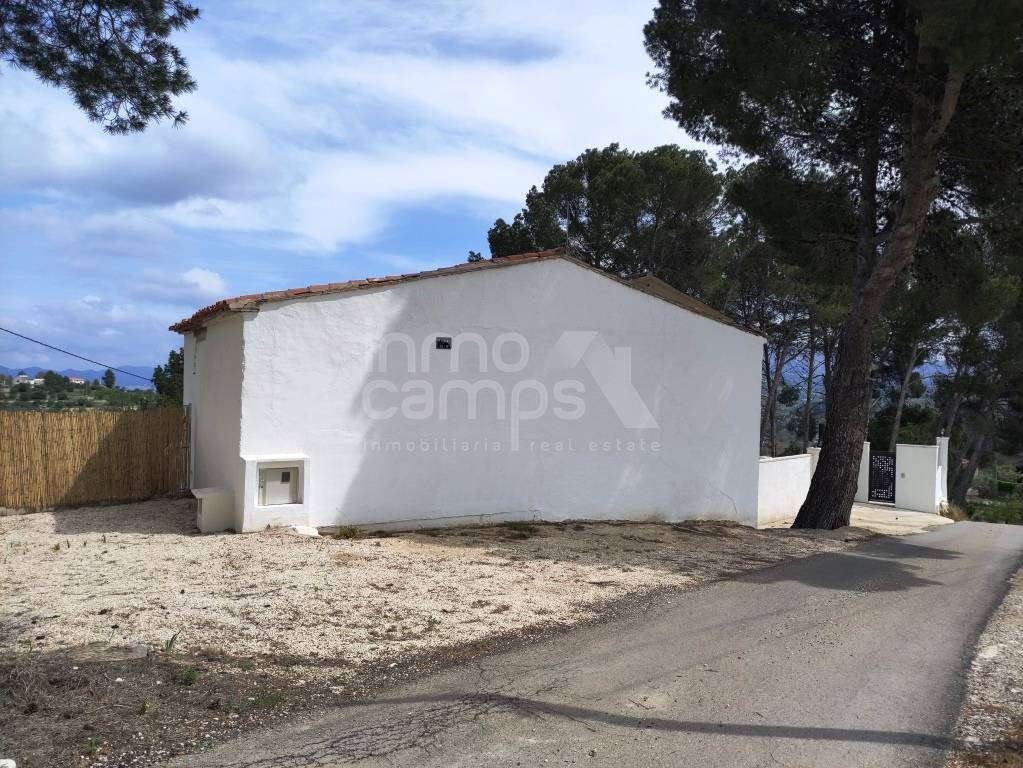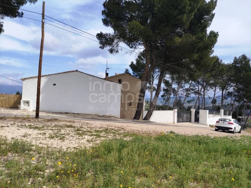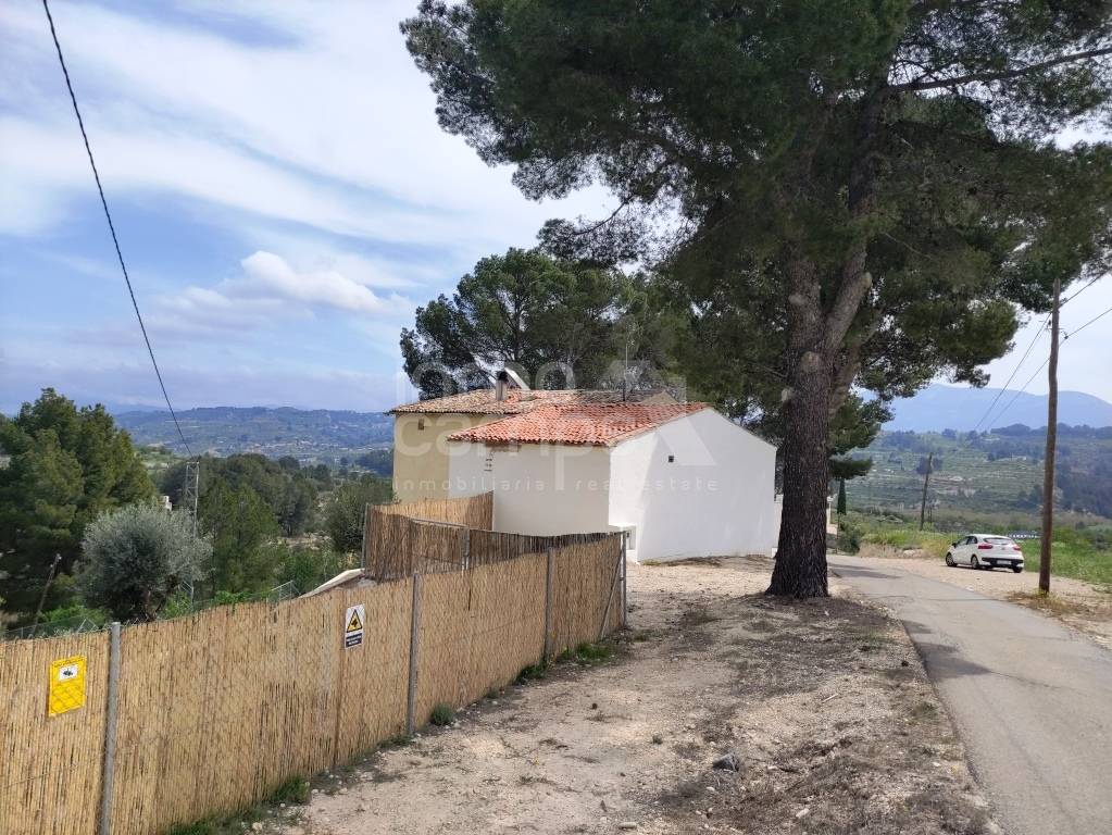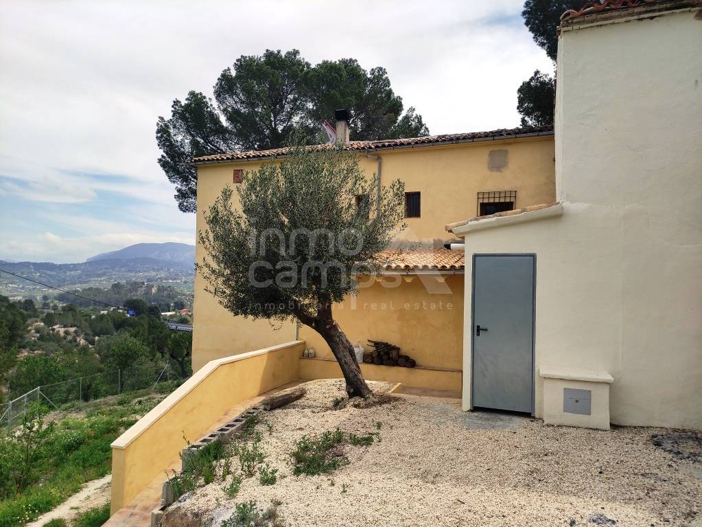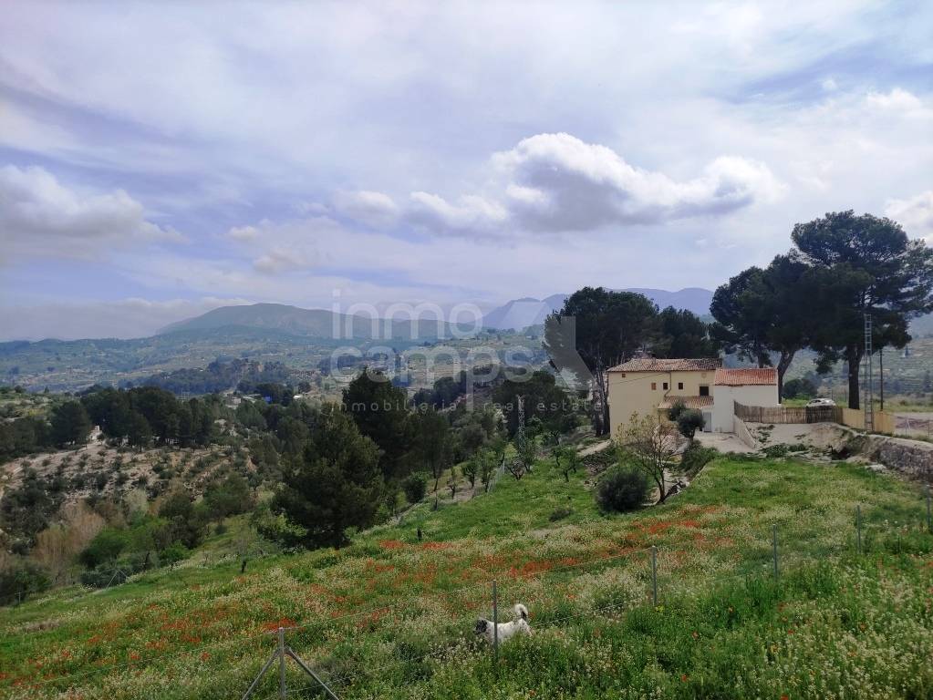 El terreno de 29.933 m² está completamente vallado y rodea la casa principal, con acceso automatizado, cultivos de olivos y almendros, y vistas despejadas al paisaje montañoso de la comarca del Comtat. También dispone de una construcción adosada que requiere reforma, ofreciendo aún más posibilidades.