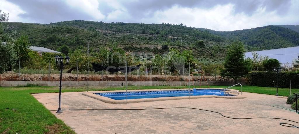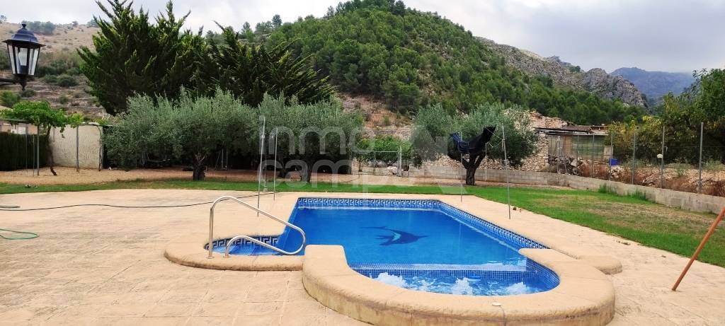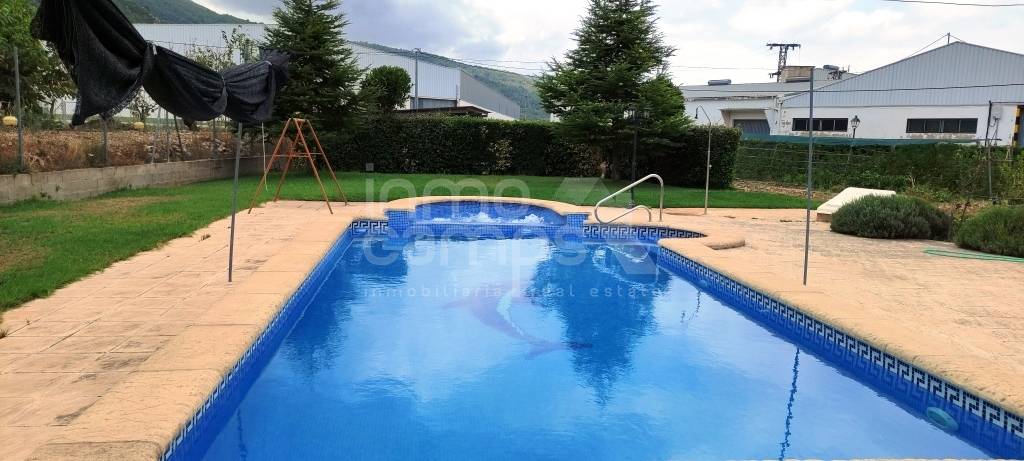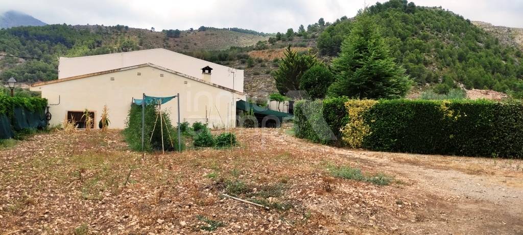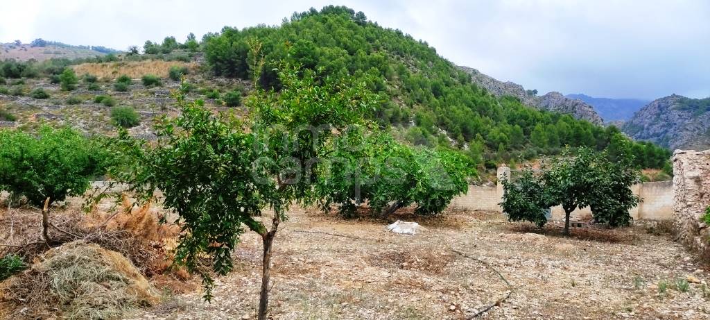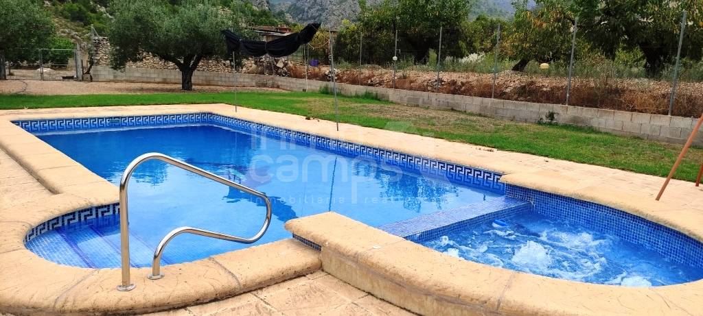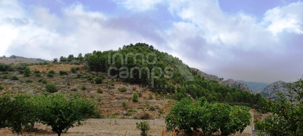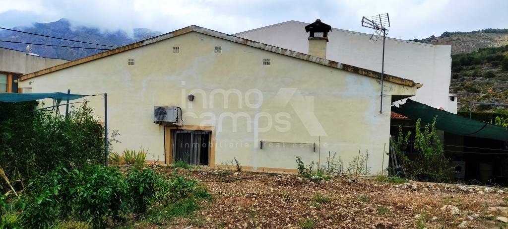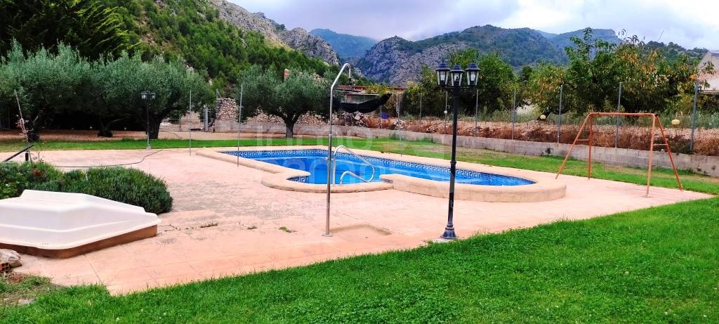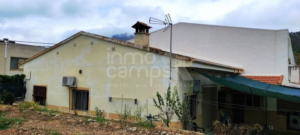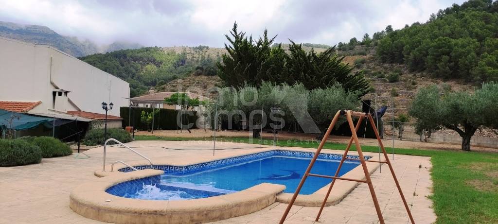 Urban plot for sale in Lorcha on a sunny quiet location on the outskirts of the village. The property has a surface of 114 m² built and comprises of 2 bedrooms, toilet, large open plan kitchen / lounge with fireplace and air conditioning. Standing on a generous 2,556 m² land plot, with olive and almond trees, landscaped garden, barbecue, solarium and large filtered pool with jacuzzi. This property serviced by mains electricity, mains water and fireplace. Excellent location having all services within walking distance and with stunning mountain views. This property gives you the possibility to develop your own property.
