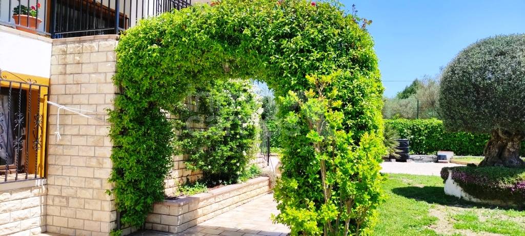 - Ornate garden with decorative trees, olive trees, hedges, and landscaped areas.