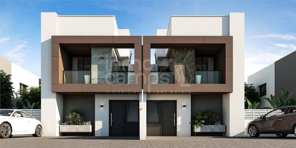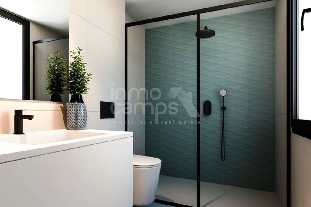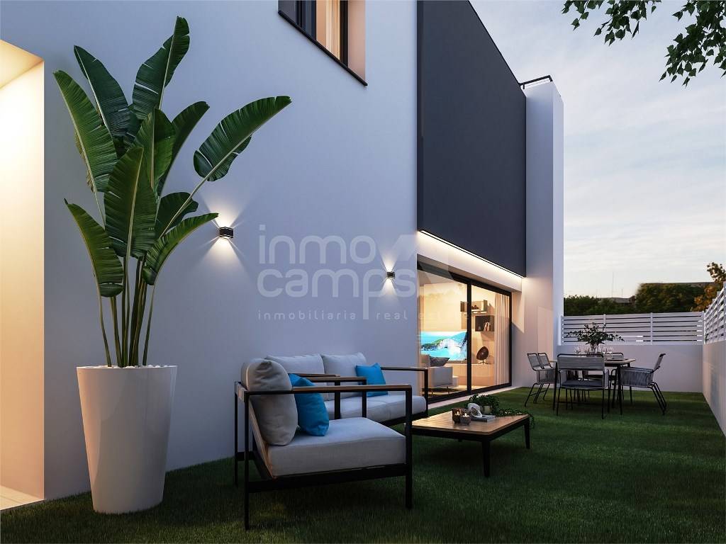 On the upper floor, you'll find a master bedroom with a walk-in closet and a private bathroom, plus another bedroom with a terrace. The bathrooms are stylish and contemporary, and built-in wardrobes offer plenty of storage space. Additionally, the property includes 2 parking spaces and expansive common areas with a children's playground and a communal pool.