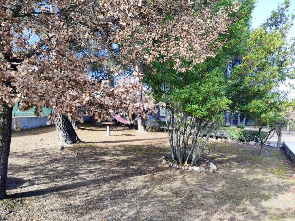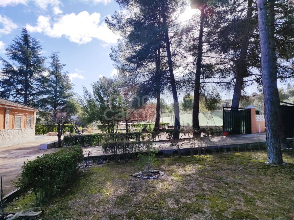 Set on a fully fenced plot of 5,258 m², the land includes landscaped areas and olive trees, providing privacy and generous outdoor space. Additional features include a swimming pool, barbecue area, and covered parking for several vehicles.